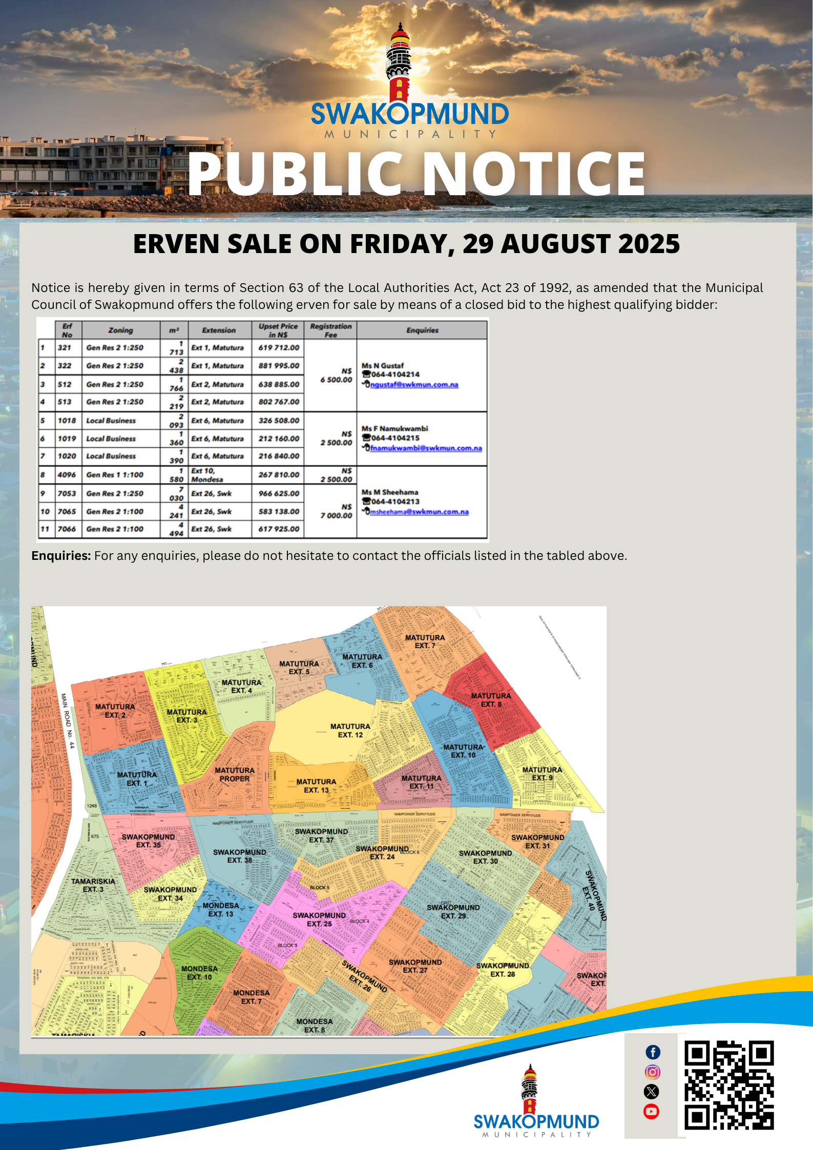 Notice is hereby given in terms of Section 63 of the Local Authorities Act, Act 23 of 1992, as amended that the Municipal Council of Swakopmund offers the following erven for sale by means of a closed bid to the highest qualifying bidder: